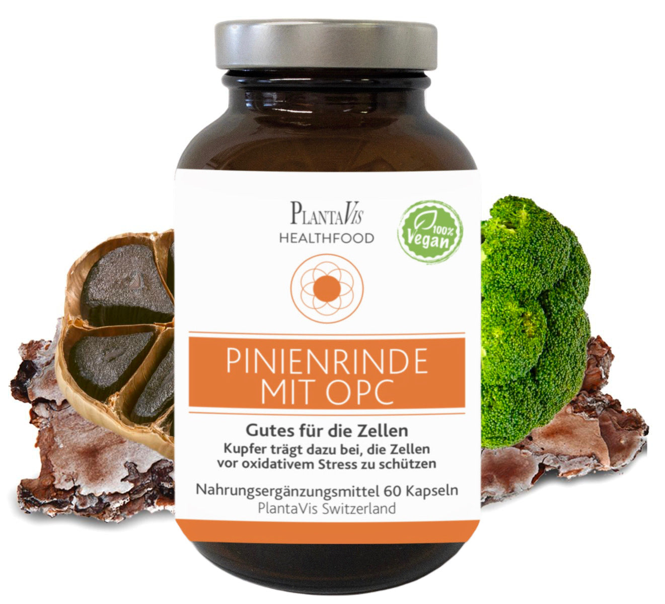 Nahrungsergänzungsmittel: ganzheitlicher Naturstoffkomplex mit Pinienrinden Extrakt (95% Oligomere Proanthocyanidine OPC), ZellschutzKomplex (Camu Camu Extrakt mit 20 % Vitamin C, Vitamin C, Jiaogulan Extrakt, Cordyceps Sinensis Pulver, Shiitake Pulver, Kapern Extrakt, Astragaloside Extrakt I-VII, Gersten Extrakt mit 20-25 % ß-Glucan, Chlorophyllin, Melonen Extrakt (Extramel®) enthält bioaktive Superoxiddismutase (SOD), schwarzer Pfeffer Extrakt mit 95 % Piperine), Eisengluconat, Vitamin C, Burma Spirulina Pulver, Brokkoli Extrakt, Karotten Extrakt, Kohlgemüse Extrakt, Polypodium Leucotomos Pulver, Granatapfelschalen Extrakt, ballaststoffreiche Akazienfaser (Fibregum TM), schwarzer Knoblauch Extrakt, Trennmittel: Magnesiumsalze der Speisefettsäuren, Mittelkettige Triglyceride Öl, Beta Carotin, Knöterich Extrakt, Kupfergluconat, Vitamin D2, Vitamin B6 - hochwertiges Qualitätsprodukt von PlantaVis.