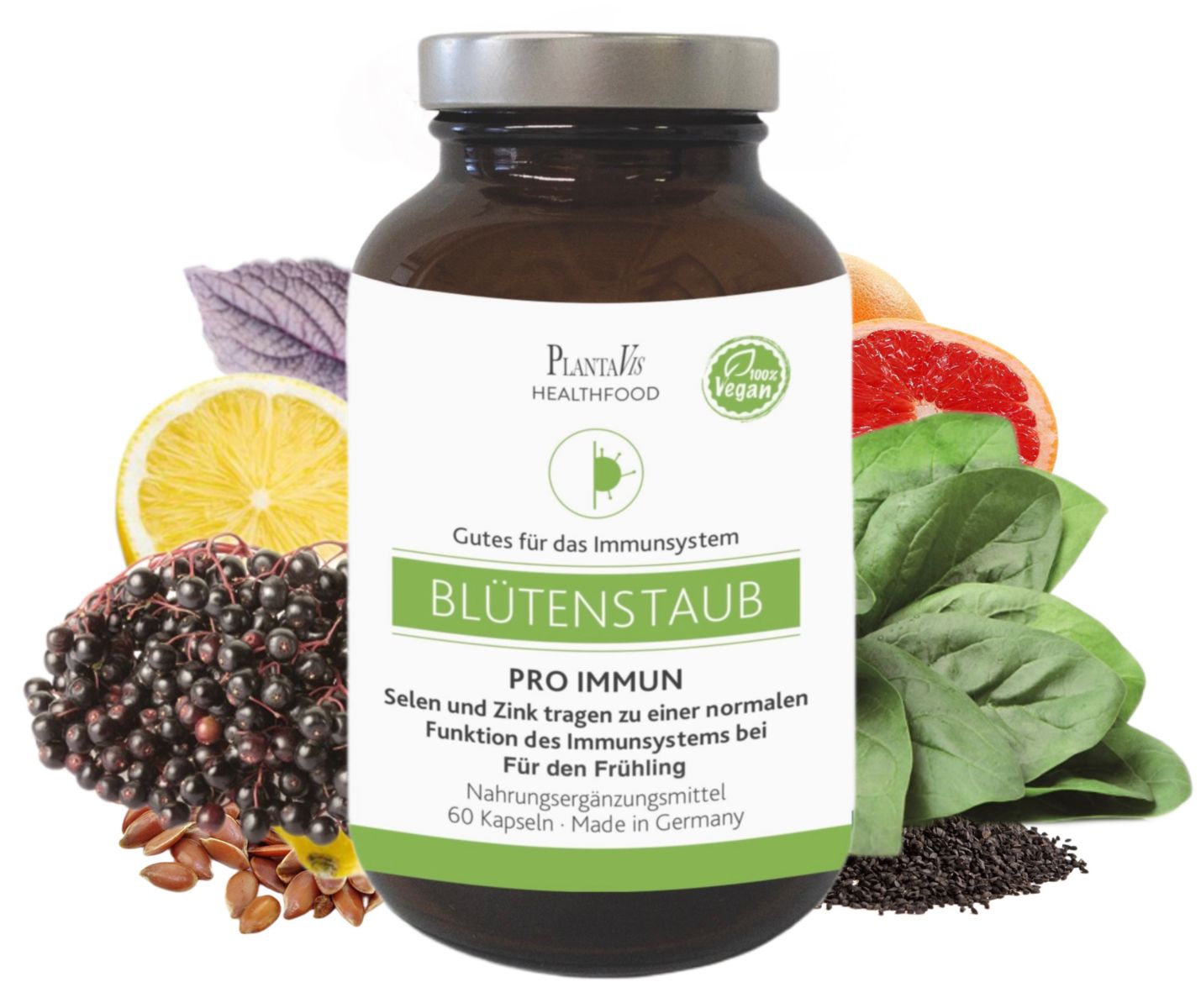 Die Versorgung mit Mineralien und Vitaminen ist nicht nur lebensnotwendig, sie hilft auch dabei, die gesunden Körperfunktionen aufrechtzuerhalten und das Wohlbefinden zu steigern. Denn die deftige, fette Winterkost gilt nicht gerade als reich an wichtigen Mikronährstoffen – deshalb brauchen wir gerade im Frühling vitamin- und mineralstoffreiche Nahrung. Gefragt sind vor allem Vitamin C und Vitamin B6 sowie Calcium, Magnesium, Selen, Zink und Mangan. Schliesslich geht es darum, wieder leistungsfähig zu werden und das Immunsystem zu stärken. Diese essenziellen Spurenelemente sind wesentlicher Bestandteil der Wirkstoffkombination in den „Pro Immun“-Kapseln von PlantaVis. Alle Inhaltsstoffe werden schonend aus hochwertigen natürlichen Rohstoffen gewonnen. Ein weiteres Plus bildet unser exklusiver Zellschutzkomplex aus ausgewählten Pilz-, Frucht- und Kräuterextrakten sowie -pulvern mit zusätzlichem Vitamin C und weiteren Pflanzenstoffen.