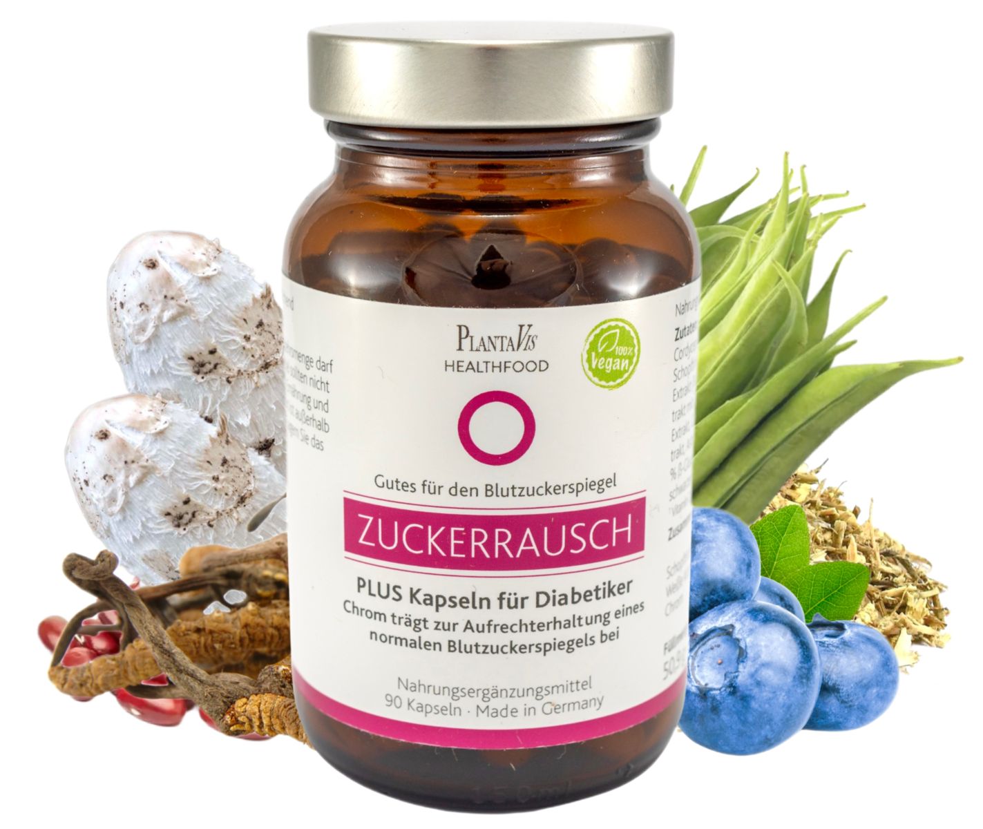 „Die ZuckerRausch Plus Kapseln – Gutes für den Blutzuckerspiegel“ enthalten Chrom in Form von Chrompicolinat, da dieses deutlich besser im Darm aufgenommen wird als andere Chromverbindungen. Weitere Komponenten der Rezeptur sind Extrakte aus Queckenwurzel und weissen Kidneybohnen sowie Pulver aus Schopftintling, Guarkern, Blaubeeren und Cordyceps Siensis. Zusätzlich enthalten die Kapseln Vitamin C sowie den exklusiven PlantaVis-Zellschutzkomplex.